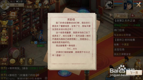 李捕头处领取使命,获得一张纸条,有正背面。正面的关头信息是“TYC,XYX”,翻译过来就是“天墉城,逍遥仙”