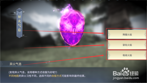 当你寻到了异火的处所时辰,走近异火。然后点击界面中的回话按钮。选择一种收服异火的体例。这里我选择克服异火。如图所示。