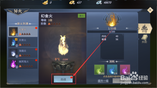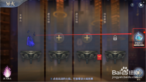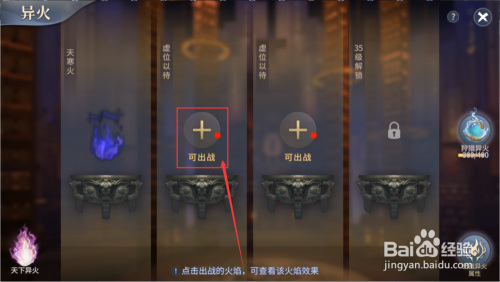 然后回到异火界面,点击出战按钮,选择出战的异火。然后在响应的异火下面,点击出战按钮,就能出战了。能增添我们游戏脚色的各类属性和战力。如图所示。