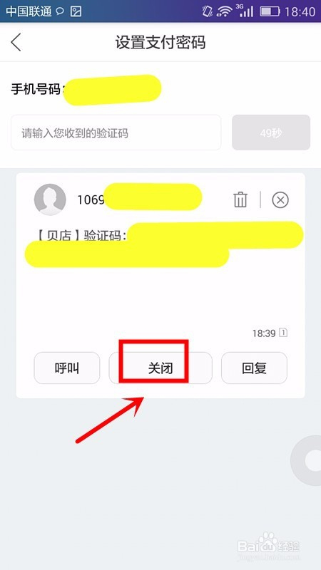 这时,手机就会收到贝店给我们发送的验证码短信,我们点击封闭即可;