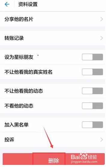 6.在要删除联系人的【资料设置】本家儿页面中,可以在最下面一栏看到有个【删除】按钮,点击即可,如下图所示。当然若是不想删除还可以点击【打消】按钮。