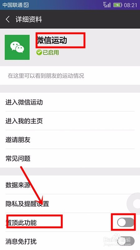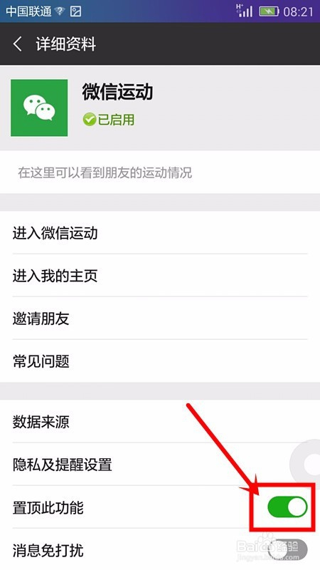 此时可以看到微信活动的具体资料页面,我们从页面中找到置顶此功能选项,我们可以看到此时为封闭状况;