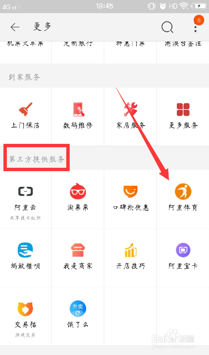 看到【第三方供给办事】下面的【阿里体育】,点击进入。