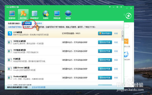 庇护网速设置。点击庇护网速,可以选择“看网页”网速庇护或“玩游戏”网速庇护,点击开启和封闭,可以设置浏览器网速庇护。
