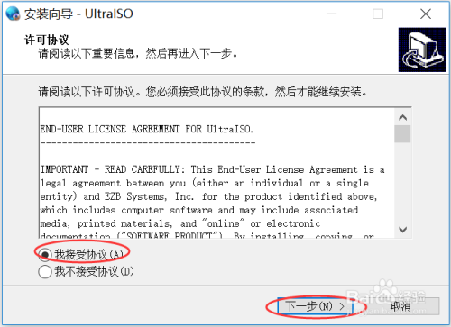 进入安装标的目的导,许可和谈页面,选择“我接管和谈”,然后点击“下一步",如下图所示: