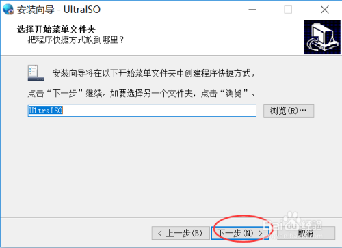 浏览选择开始菜单文件夹,然后点击“下一步",如下图所示: