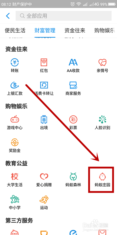 在付出宝应用页面,下滑找到“教育公益”,鄙人面有一个“蚂蚁庄园”我们选中并单击。
