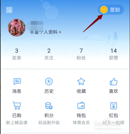 在本身本家儿页面的右上角有签到按钮,如图所示,点击签到按钮。