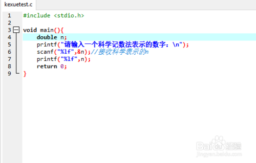 然后利用printf打印出提醒语句,本家儿要用来提醒用户该输入的数值类型,然后利用scanf语句用来接收输入,注重此中的上下文要为%e,暗示科学记数法暗示方式