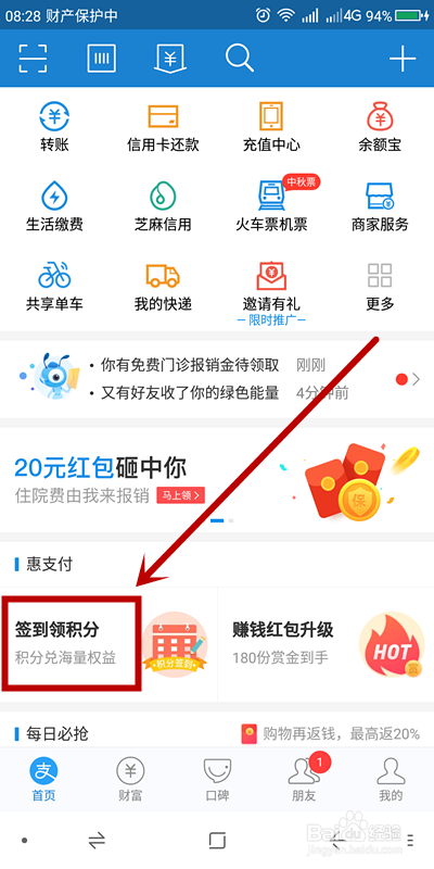 在付出宝首页找到“惠付出”项面前目今的“签到领积分”并单击
