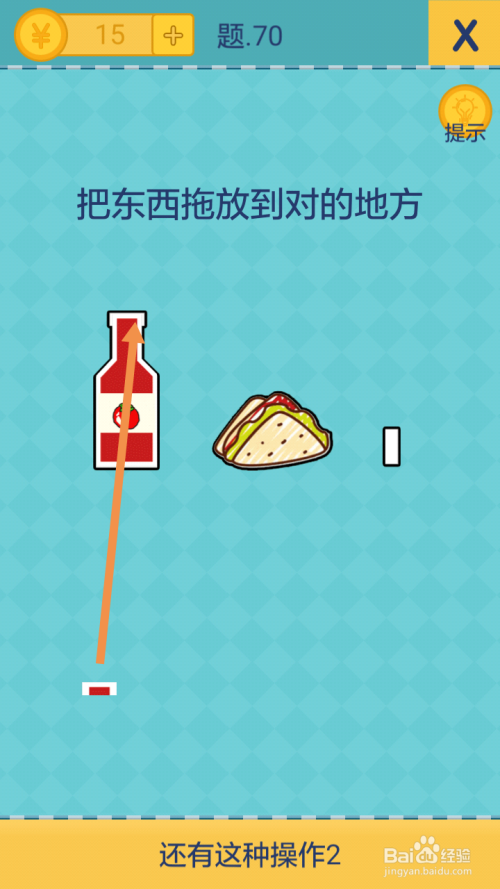 第70关将瓶子和瓶盖拖动到瓶子外形的空白处,把三明治拖动到三明治外形空白处就过关了。