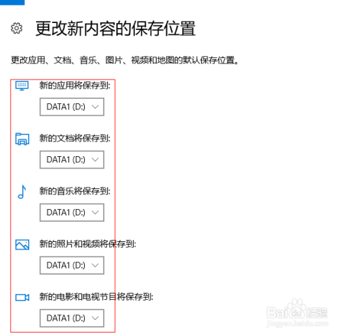 第四步:把"新的应用、新的文档、新的音乐、新的照片和视频及新的片子和电视节目“全数选择保留在“D盘”(如下图);
