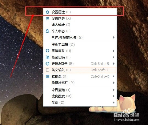 首先,请大师打开搜狗输入法的状况栏图标,然后对着这个状况栏图标击右键,选择“属性设置”。