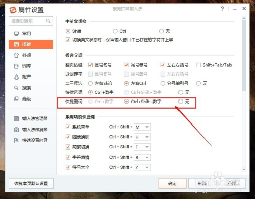 在快捷删词设置中,我们既可以选择默认的快捷键,也可以选择其他的快捷键来删除这些词语,然后点击最下方确定按钮保留设置。