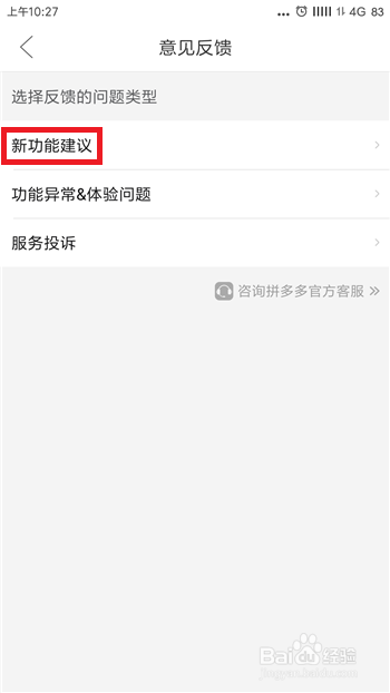 进入到定见反馈界面后可以看到有三个选项,肆意点击一个,小编这里点击【新功能建议】。