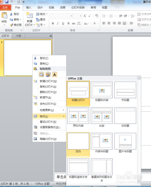 将幻灯片版式设置为空白。