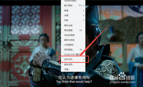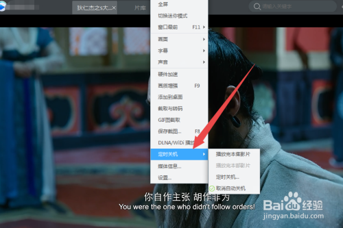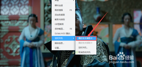 然后在播放的视频窗口中鼠标右击,在呈现的菜单中将鼠标放在 按时关机 选项上面,可以看到有 播放完本集影片 、播放完本部影片、按时关机等几个选项。