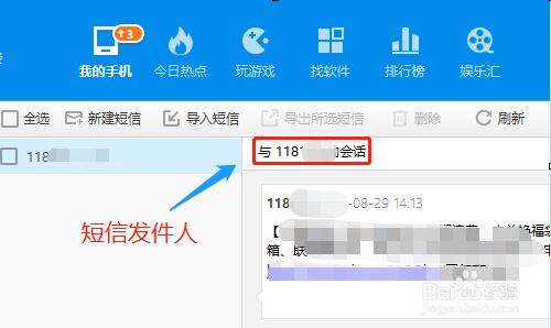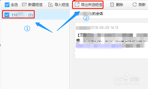 短信对应的右侧窗口里,我们可以看到所有短信信息以及对应的发件人,我们选中那几个比力主要的短信,然后点击上方的“导出所选短信”,如图二...