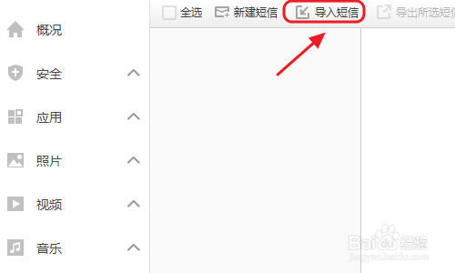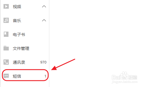 貌似没有找到短信选项?不要焦急!我们随意点击照片或者视频此中的某一项,然后在新页面左侧的列表中就能看到“短信”了,见下图;