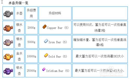 铜水壶一次可以浇灌3个格庄稼,金水壶和铱水壶可以或许按面积浇灌(如下表)。