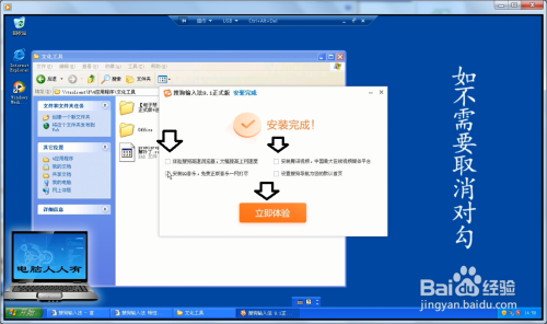 安装完毕,注重不要当即点击体验,那样就会安装良多用户并不需要的软件!而是打消默认的选中对勾之后,再点击当即体验即可。
