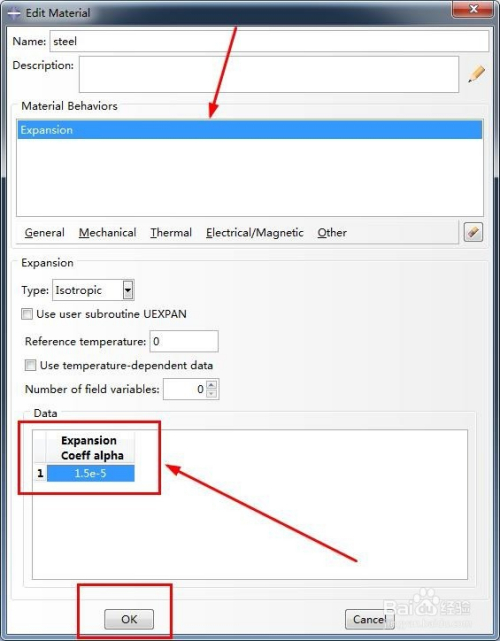 可以看到材料属性中已经添加了expansion(线膨胀系数),点击下方的expansion coeff alpha,填入钢铁材料的线膨胀系数,是1.5e-5