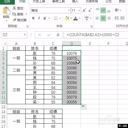 然后在对应单位格输入公式=COUNTA($A$2:A2)*10000+C2