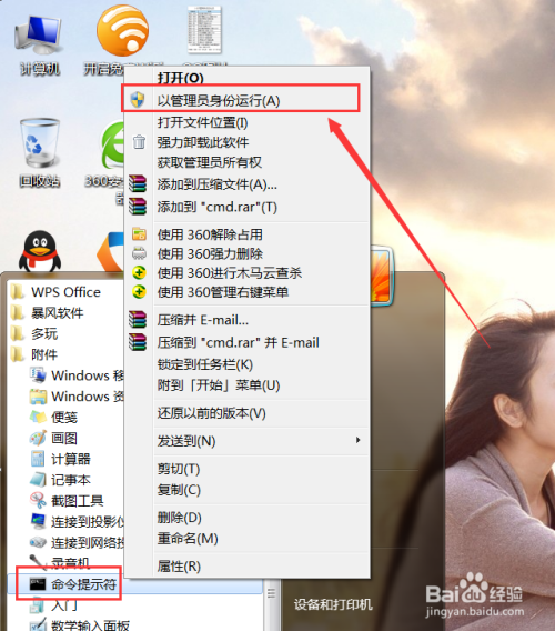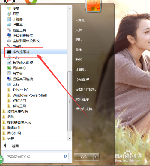 首先,请大师打开Win7系统中的开始菜单,在开始菜单中找到-附件选项,并找到号令提醒符法式,如下图所示。