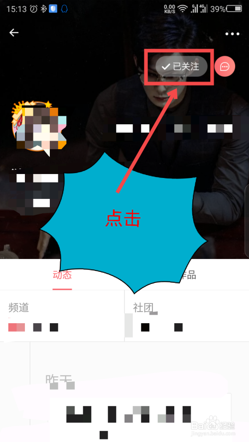 在用户详情界面,点击顶部的已存眷三个字。如图所示