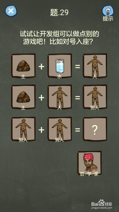 第29关土+水=人,土+人=汉子,汉子+汉子=哲学家。