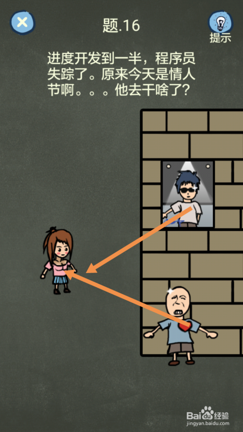 第16关将法式员拖动到女孩身边,然后将爱心拖动到女孩身上就过关了。