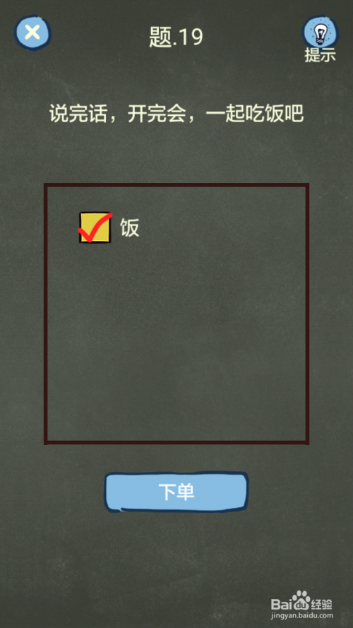 第19关屏幕往左拉,在饭前面打√,然后点击下单就过关了。