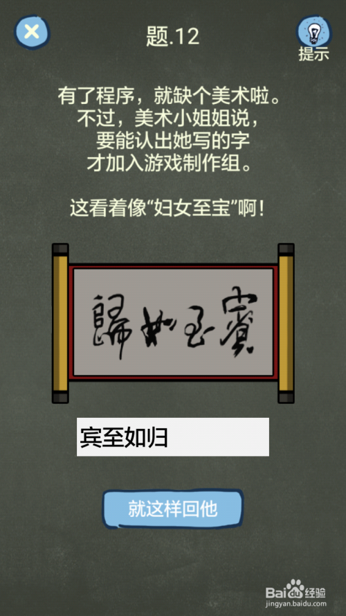 第12关输入宾至如归然后点击就如许回他就过关了。