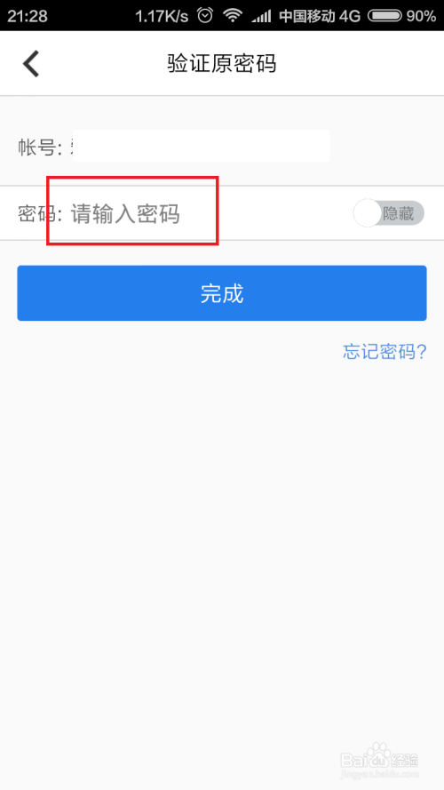 接下来,我们仅需要在该页面中输入QQ账号本来的密码,然后点击完成按钮之后,原先的密码验证当作功之后即可跳转到新密码的设置页面。