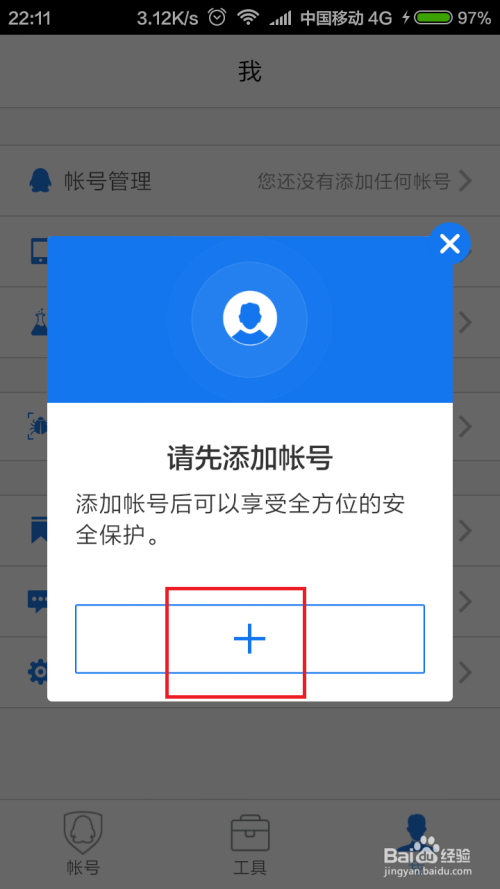 接下来,在弹出的页面中点击选择“添加账号”按钮,只有添加账号当作功之后,我们才可以进行下一个操作。