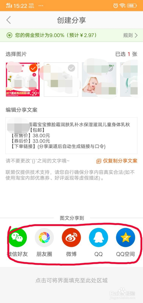 好比我选择一条目婴儿面霜产物推广,点击此条目产物后面的“分享”按钮。产物下面标有佣金。如下图所示。