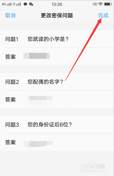 这里有三个问题,可以从头输入本身的谜底,最后点击右上角的完当作,即可将密保重设。