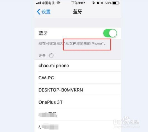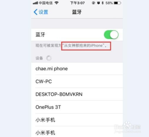 那么大师发现了没有,这个蓝牙名称不就是我本身设置的手机名称吗,那么若是我点窜了苹果的手机名称,那么蓝牙名称是不是也被点窜了。