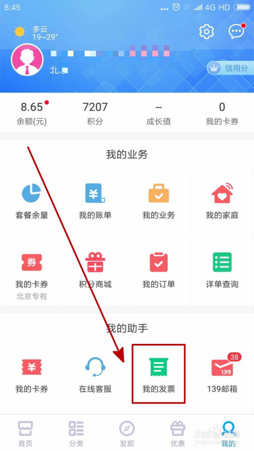 进入我的信息页面后,我们可以看到本身的小我信息、星级、话费余额等,我们标的目的下找到“我的发票”并点击进入。