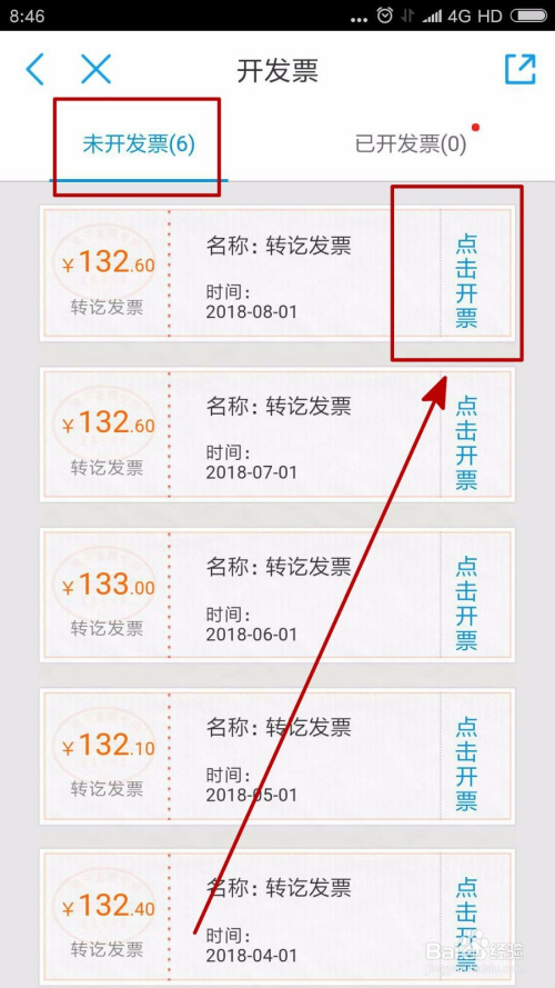 进入开辟票界面后我们可以看到两个标签,别离是未开辟票、已开辟票。我们选择默认的未开辟票,可以看到今朝可以开具的发票信息。我们点击后面的“点击开票”。