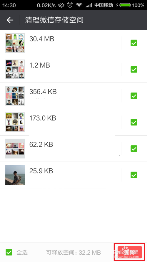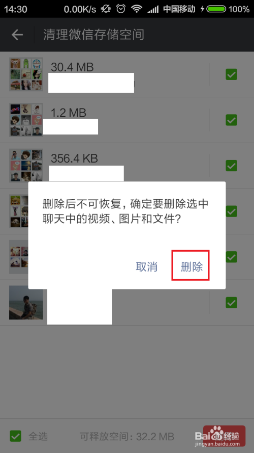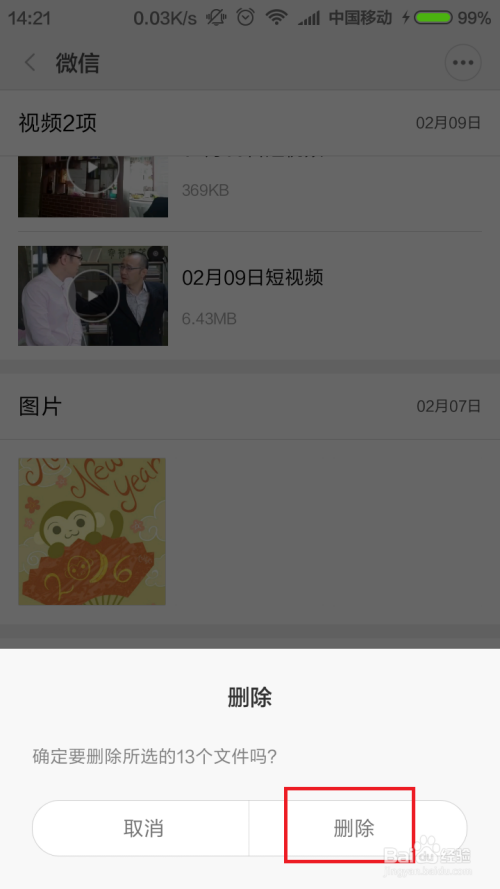 接下来,等我们确认需要删除此中的某些文件之后,点击功能页面下方的“删除”功能即可删除聊天中存在的小视频文件了,当然随之删除的也有聊天图片,若是你只想删除小视频不想删除图片的话,可以仅选择删除微信小视频。