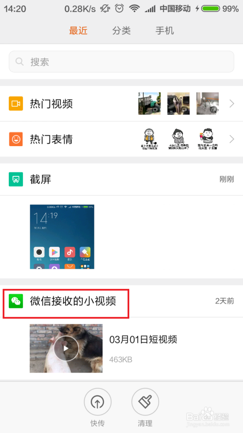 在MIUI系统中,我们也可以执行不异的功能,并且更高效。打开MIUI系统中的文件夹页面,在文件办理器首页即可看到微信小视频选项。