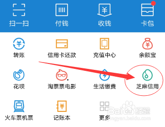 2.用付出宝账号和密码登录进入付出宝本家儿页面之后,在第一栏下方点击【芝麻信用】这个图标,如下图所示。