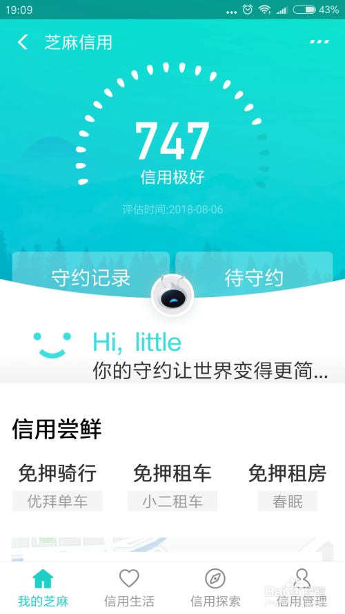 3.进入小我【芝麻信用】本家儿页面之后,点击右下角的【信用办理】按钮,如下图所示。