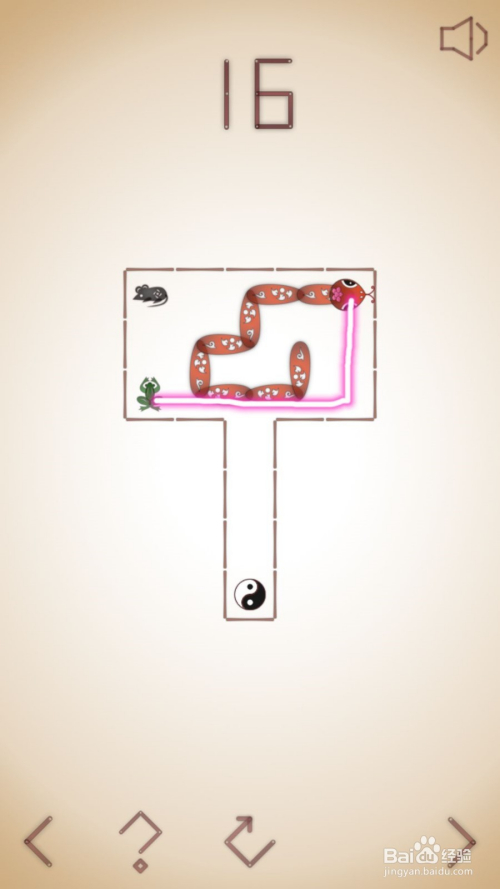17、先吃甲由,左边的青蛙,反标的目的之后我们先在底下空白区域转个头,之后去吃靠上的老鼠,青蛙,反标的目的吃底下青蛙,上边的青蛙,吃上边青蛙时往右边多走一点,如图,最后吃失落老鼠通关就OK