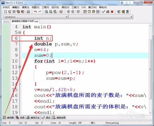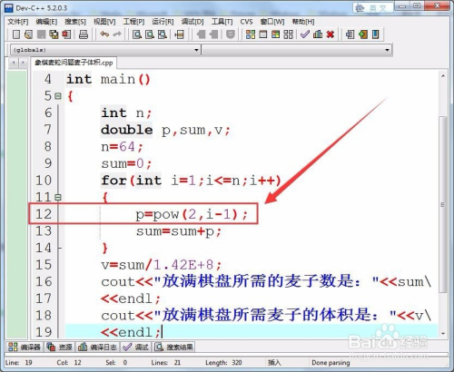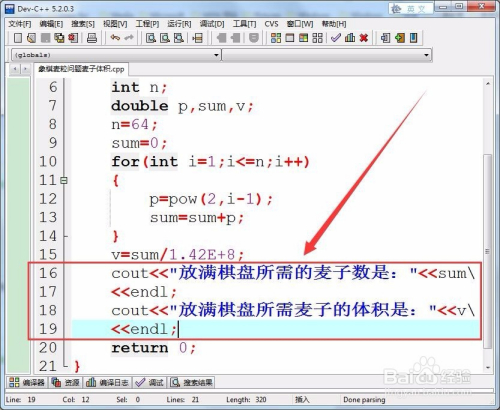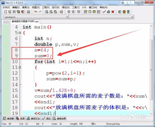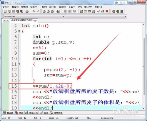 接着,界说3个双精度浮点数,保留2的幂数、麦粒总数和麦子体积。