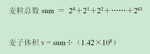 放满整个国际象棋棋盘所需的麦粒数和麦子体积,可用以下算式计较。