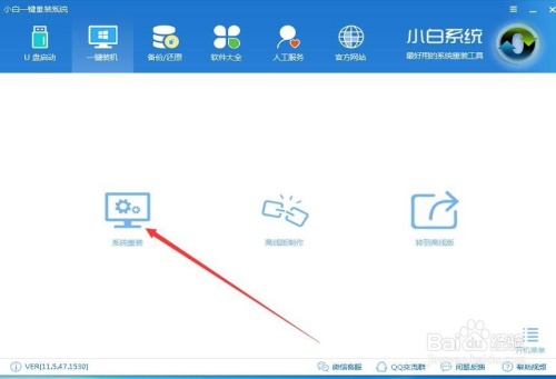 在百度搜刮小白一键重装系统并把软件下载安装好,年夜约30M的大小,启动软件后点击系统重装。