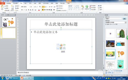 第七步:在PPT包含有“剪贴画”的版式中单击“剪贴画”图标,也可以打开剪贴画窗口,然后按上面步调设置。
