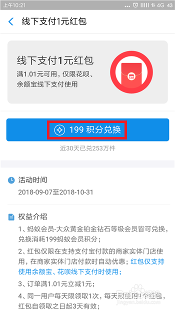 进入到一元红包活动后鄙人方可以看到具体的法则,想要兑换的小伙伴点击【199积分兑换】。